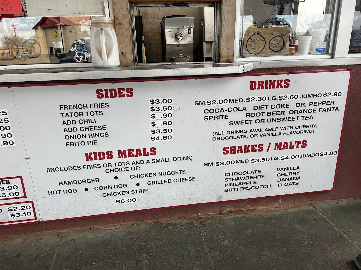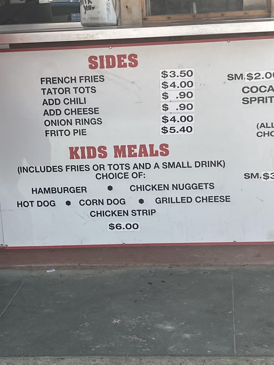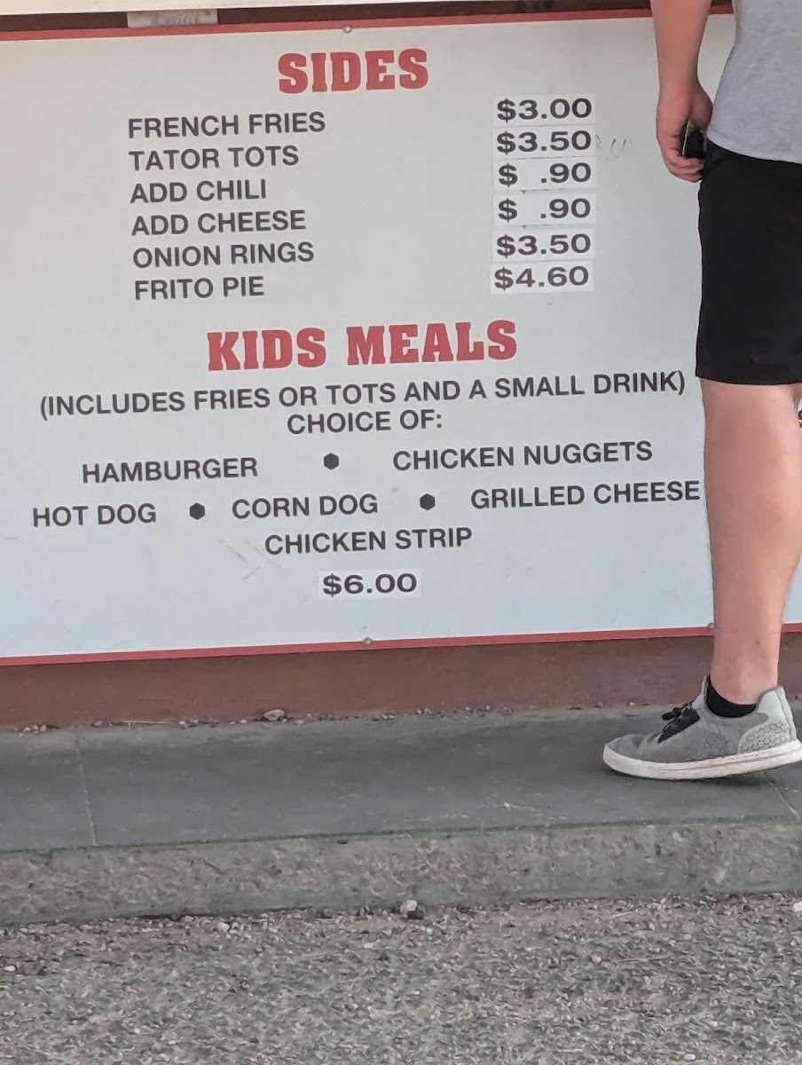 Other Foods: The menu includes various quick bites such as burritos, chili burritos, chili cheese burritos, hot dogs, chili dogs, chili cheese dogs, corn dogs, Frito pie, and mini burritos. These items offer a selection of traditional fast-food style snacks and meal additions.