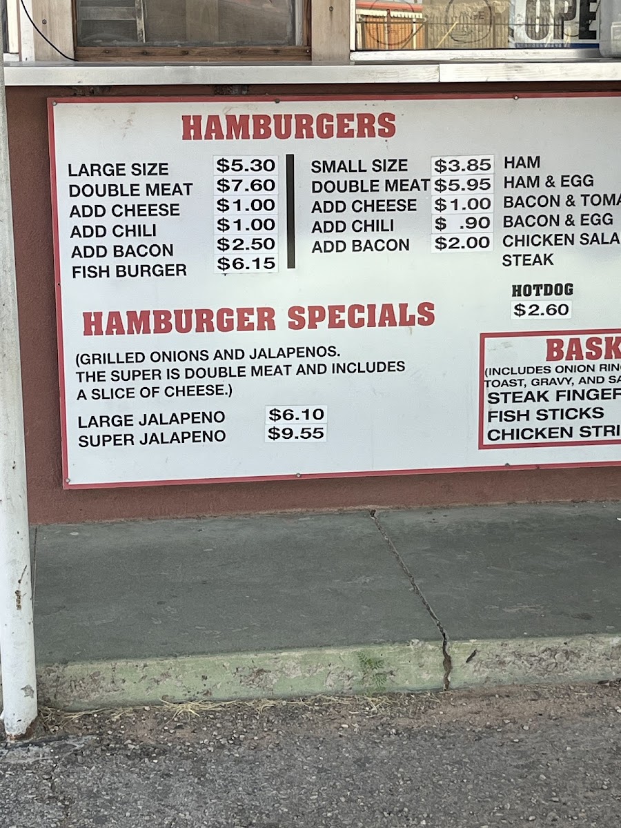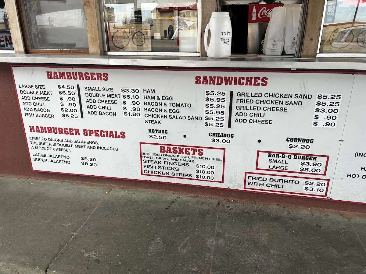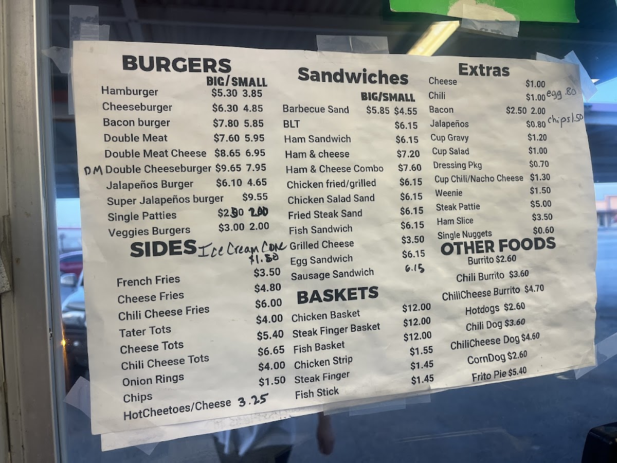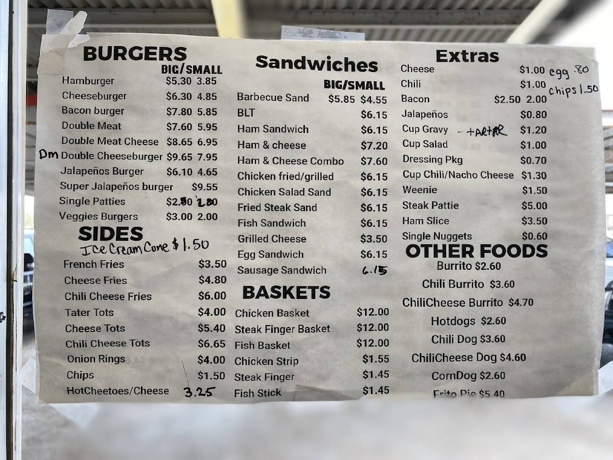 Other Foods: The menu includes various quick bites such as burritos, chili burritos, chili cheese burritos, hot dogs, chili dogs, chili cheese dogs, corn dogs, Frito pie, and mini burritos. These items offer a selection of traditional fast-food style snacks and meal additions.