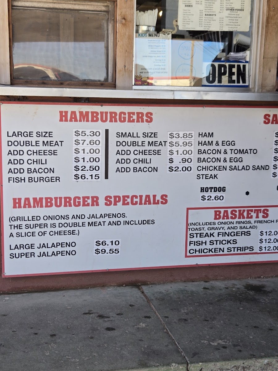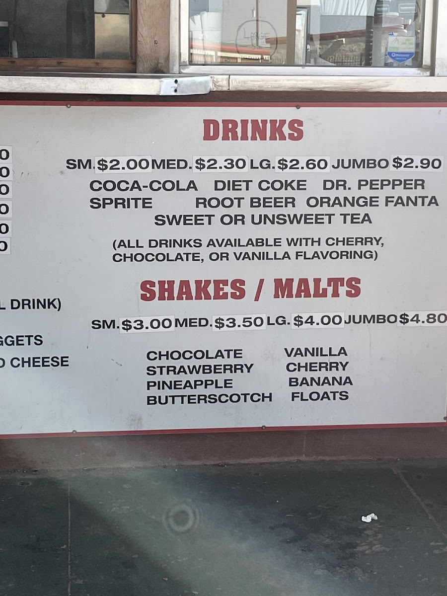 Shakes and Malts: Beverage options primarily consist of milkshakes and malts available in multiple flavors like chocolate, strawberry, pineapple, butterscotch, vanilla, cherry, banana, and floats. These are suitable for dessert or a refreshing accompaniment to the main dishes.